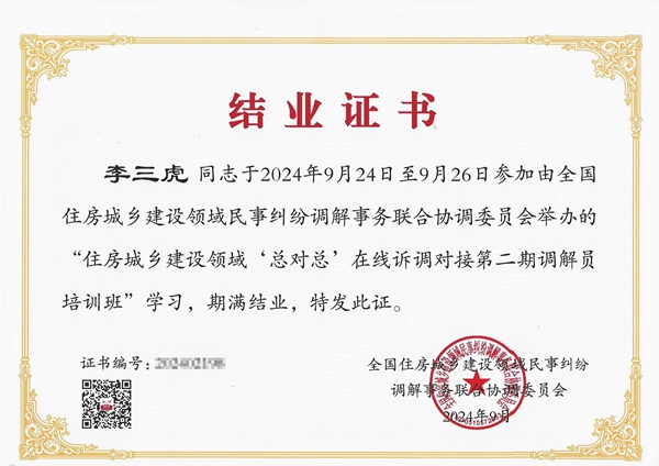 培训期间,全国住建联调委为审核认证的调解员颁发了“住房城乡建设领域‘总对总’诉调对接调解员” 证书,并为通过考试考核参加培训人员颁发了培训结业证书。
