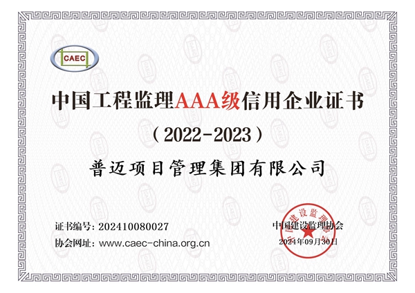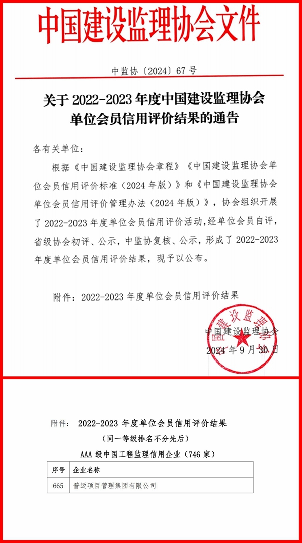 2024年9月30日,中国建设监理协会印发《关于2022-2023年度中国建设监理协会单位会员信用评价结果的通告》,公布了“2022-2023年度单位会员信用评价结果”,普迈项目管理集团有限公司光荣上榜,荣获中国工程监理AAA级信用企业评价!
