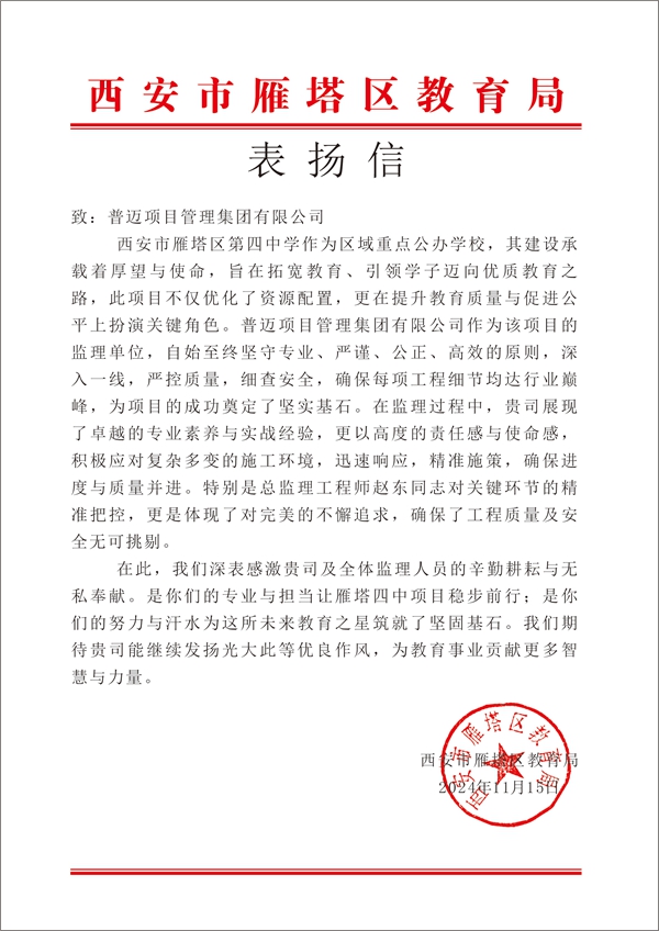 2024年11月15日,公司收到一封来自西安市雁塔区教育局的表扬信,表扬信对西安市雁塔区第四中学建设工程的监理服务工作质量予以充分肯定和认可!该项目由我公司第十五事业部承监,信中还特别对公司及总监理工程师赵东带领的项目监理服务团队提出了感谢和表扬!