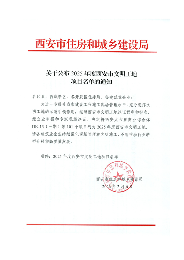 近日,2025年度西安市文明工地项目名单正式公布,公司承监的11个项目(标段)凭借出色的现场管理水平成功入选,具体获奖项目如下(按名单发布顺序排列):