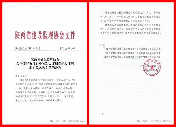 3月12日,陕西省建设监理协会正式公布了工程监理行业领军人才和青年人才培养对象名单。公司董事长景亚杰凭借深厚的专业功底、丰富的项目管理经验以及对行业发展的突出贡献,成功入选技术领军人才培养名单。副总经理王永军则以扎实的技术功底和卓越的青年骨干素质,入选青年技术人才培养名单。两位核心骨干的同时入选,充分彰显了公司在人才梯队建设和技术创新方面的雄厚实力,也体现了行业对公司综合能力的高度肯定。