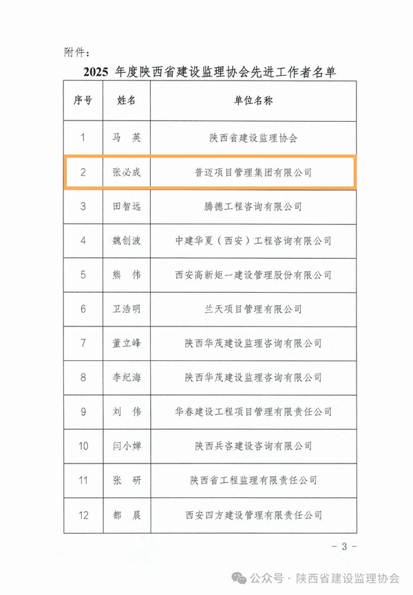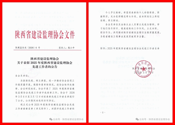 3月13日,陕西省建设监理协会公布了《关于表彰2025年度陕西省建设监理协会先进工作者的公告》,公司张必成同志光荣上榜,荣获“2025年度陕西省建设监理协会先进工作者”称号。