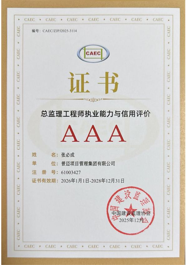 此外,在中国建设监理协会开展的全国首届总监理工程师信用评价活动中,张必成同志荣获了最高等级的AAA级评价认证,充分彰显了其良好的职业操守与行业信誉。