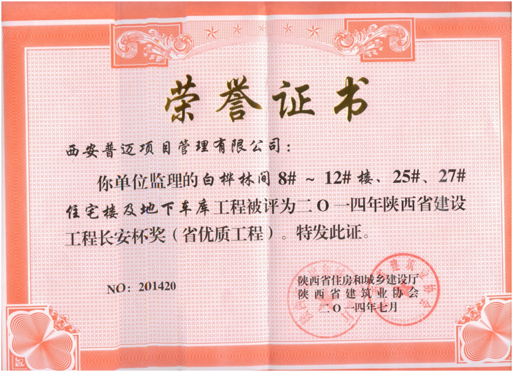 获得2014年度陕西省建设工程长安杯奖(省优质工程)